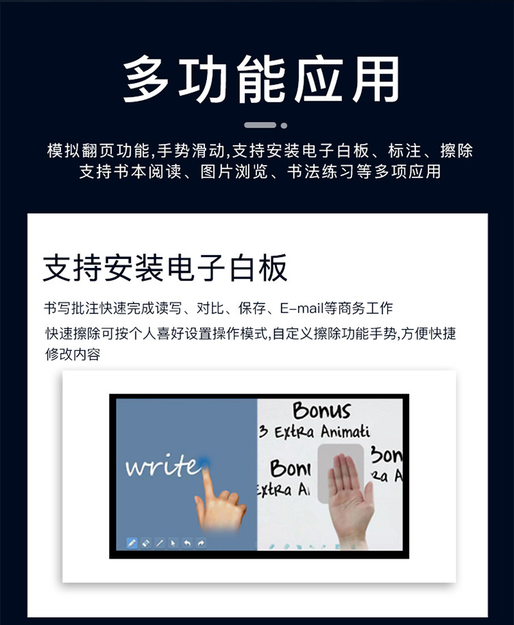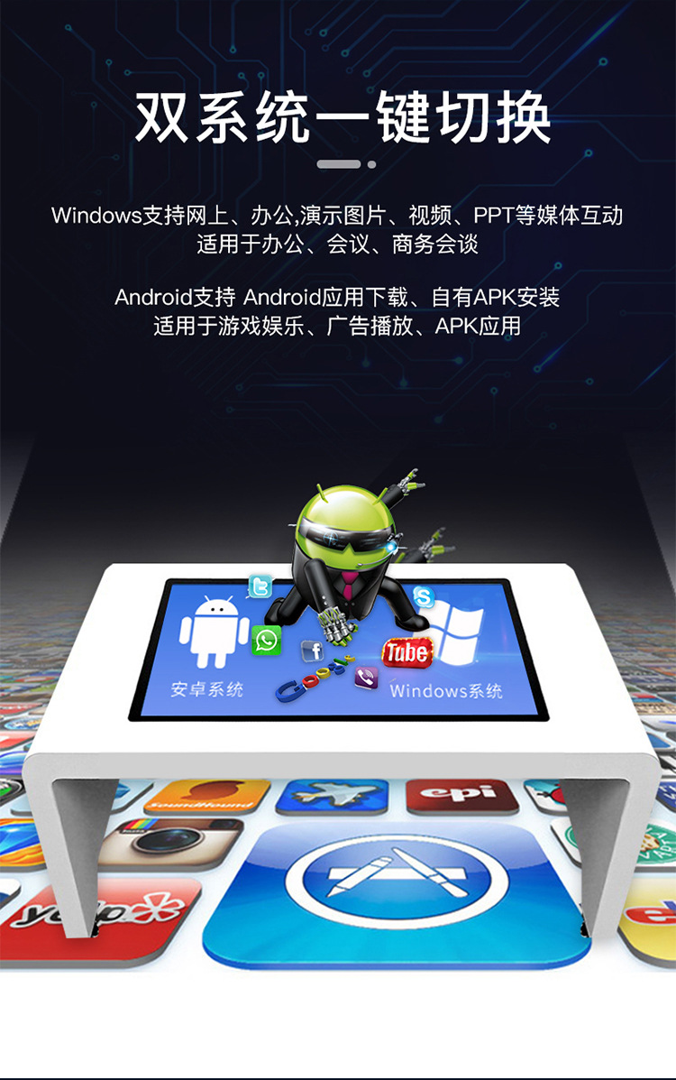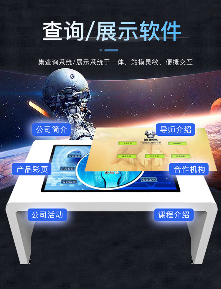 3.內(nèi)置專業(yè)操控系統(tǒng),采用多點(diǎn)觸控原理實(shí)現(xiàn)視頻圖文瀏覽、互動娛樂、解決方案、周邊推薦等多種功能,用途多樣